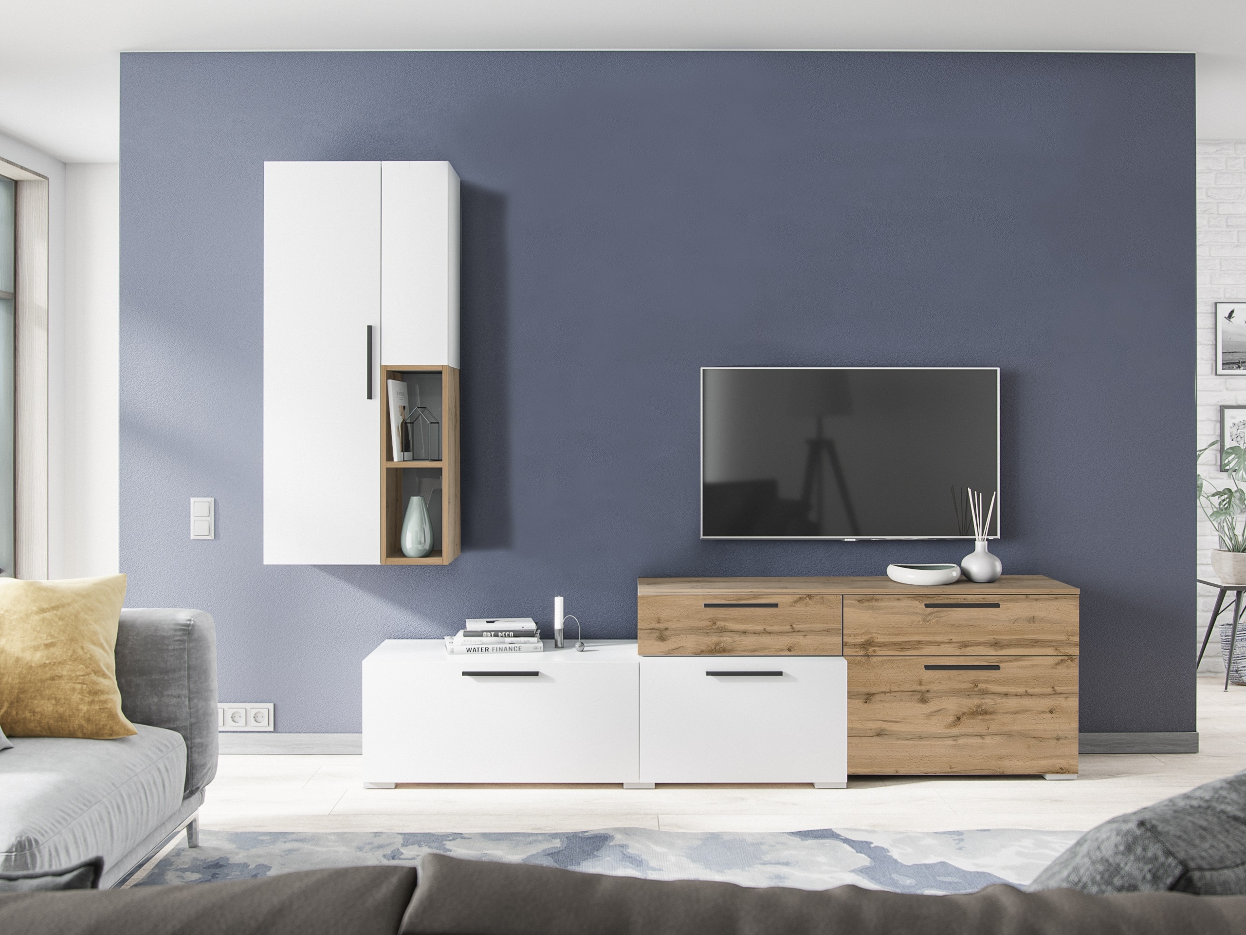 Ультрамодная и компактная гостиная Альберо станет украшением Вашего дома! Коллекция представлена навесными шкафами-пеналами, тумбами под ТВ-аппаратуру, открытыми стеллажами и навесной полкой. Благодаря разнообразию модулей Вы сможете расположить все Ваши вещи: бытовые мелочи, предметы декора, книги, технику и многое другое. Основным цветом мебели выступает белый: освежает интерьер помещения и визуально расширяет пространство. В сочетании с благородным стильным серым графитом белый цвет раскрывается по-новому.