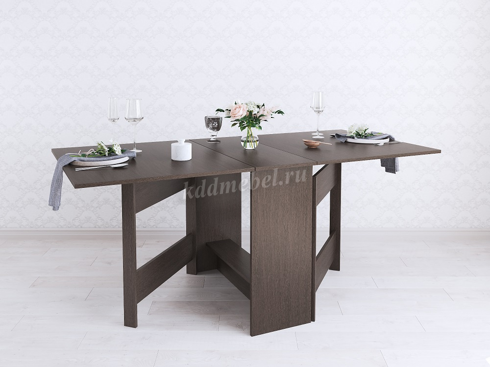 Стол имеет 3 положения: полностью сложенный, разложенный наполовину или полностью разложенный.