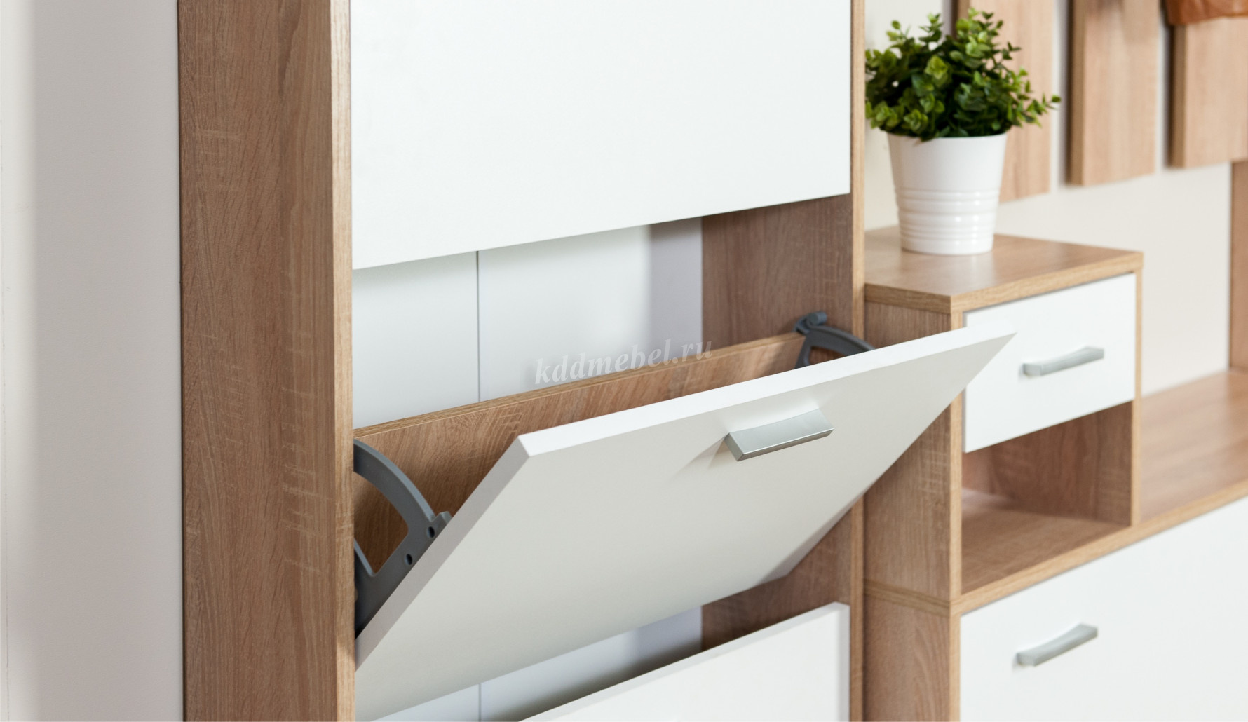 Интер – современная прихожая в стиле минимализм - минимум декора, максимум функционала. Компактная и вместительная, с небольшой глубиной – она поможет правильно организовать пространство в небольшом помещении. Прихожая включает в себя необходимые модули: вешалка с крючками, вместительные обувницы, выдвижные ящики для мелочей, зеркало.