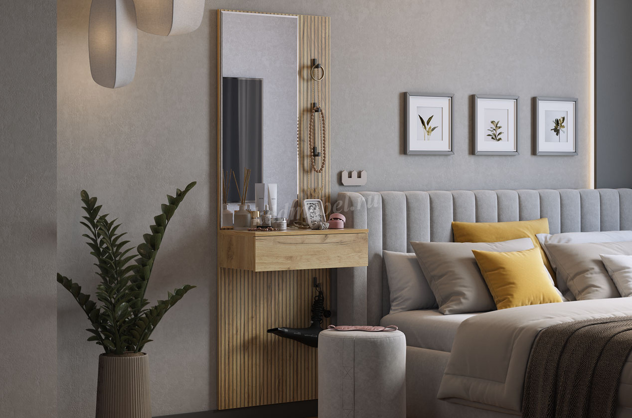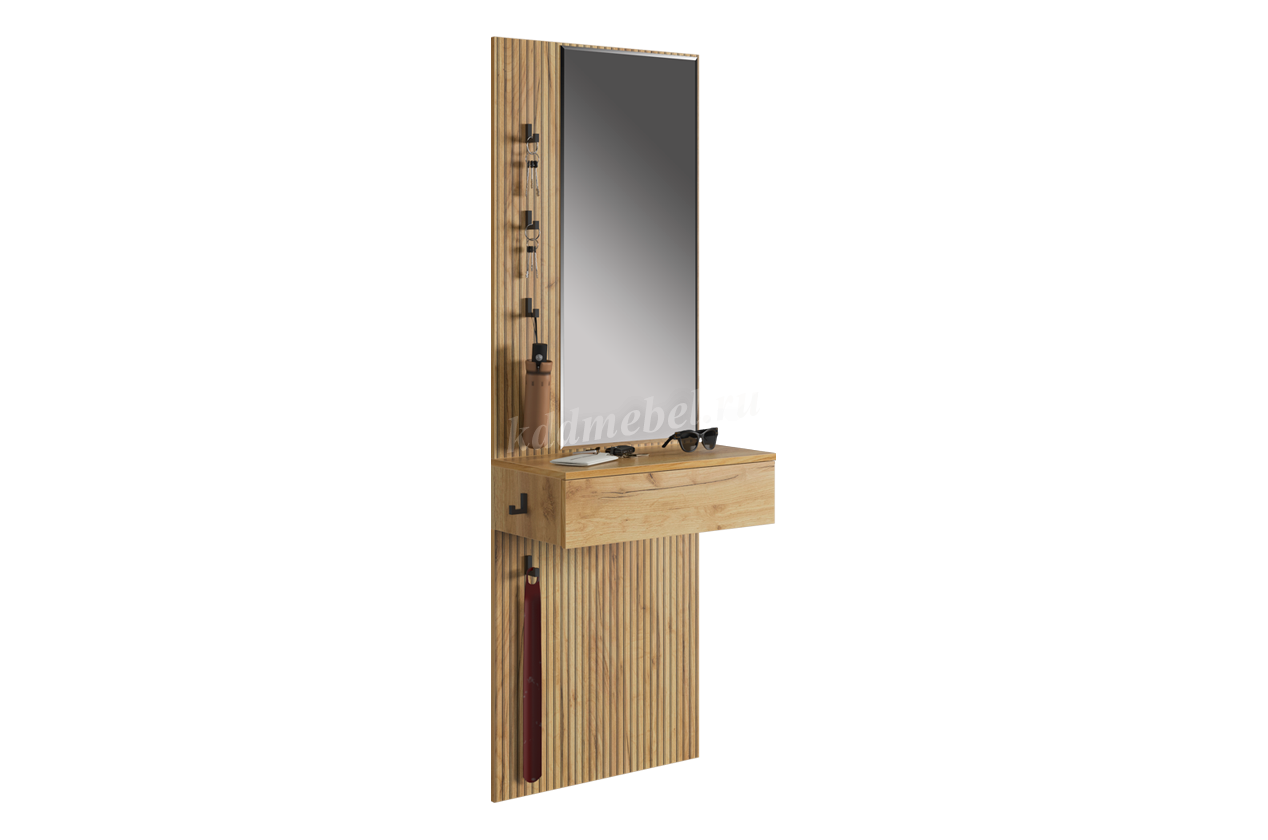 Принт, имитирующий вертикальную фрезеровку, придает зеркалу уникальный и современный вид, добавляя текстуру и глубину. Крючки предоставляют удобное место для хранения сумок или аксессуаров. Выкатной ящик служит дополнительным пространством для хранения мелочей, таких как ключи, кошелек, косметика или другие небольшие предметы.