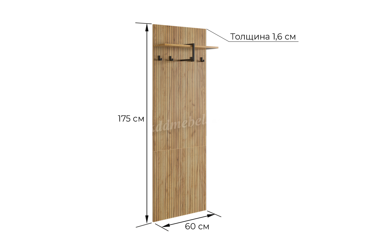 Вешалка 1 "Бодрум" – стильное и функциональное решение для организации пространства в вашем доме. Эта вешалка сочетает в себе элегантный дизайн и практичность, идеально подходя для прихожей, спальни или гостиной. Принт, имитирующий вертикальную фрезеровку придает вешалке уникальный и современный вид, добавляя текстуру и глубину. Крючки предоставляют удобное место для хранения верхней одежды, сумок или аксессуаров. Держатель для плечиков позволяет организовать хранение одежды, сохраняя ее в идеальном состоянии. Полка служит дополнительным пространством для хранения головных уборов.