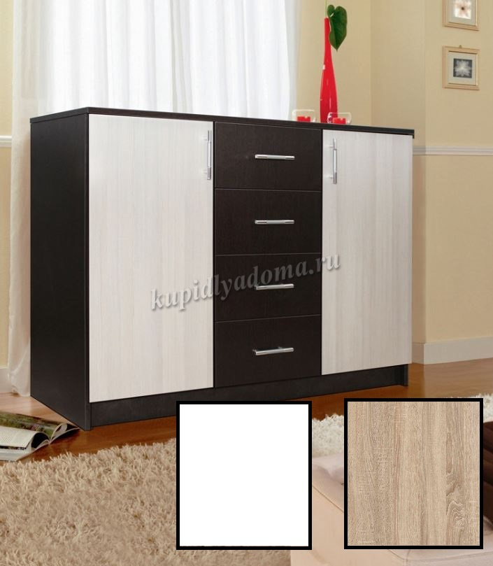 Комод имеет два больших отделения за распашными дверцами, разделенные внутри на 2 просторные полки. Посередине модели расположены четыре выдвижных ящика для разных мелочей. Дверцы открываются в сторону. Ящики выдвигаются на себя.
