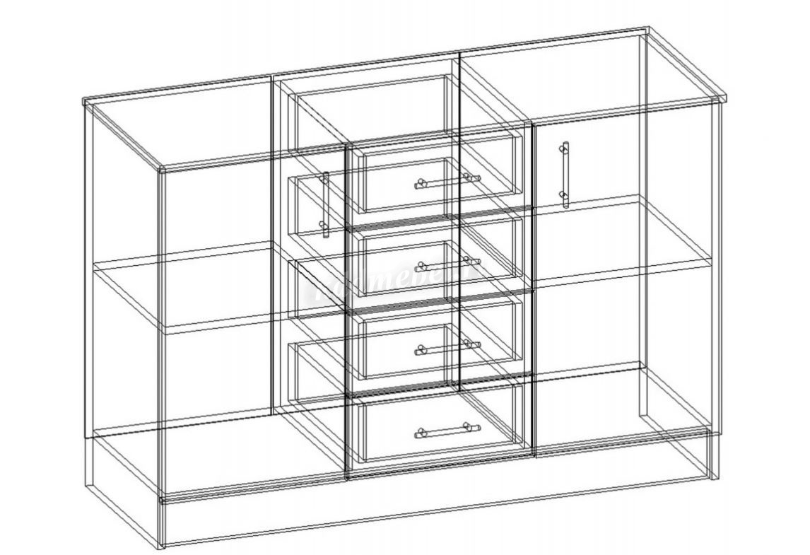 Комод имеет два больших отделения за распашными дверцами, разделенные внутри на 2 просторные полки. Посередине модели расположены четыре выдвижных ящика для разных мелочей. Дверцы открываются в сторону. Ящики выдвигаются на себя.
