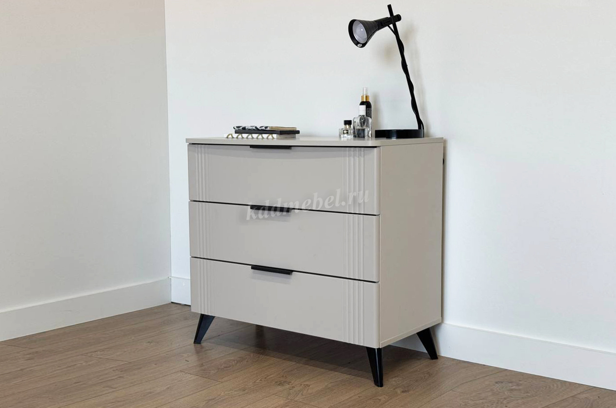 Комод изготовлен из качественных материалов: корпус выполнен из ЛДСП, что гарантирует прочность и долговечность, а фасад, выполненный из МДФ в плёнке ПВХ, не только выглядит эстетично, но и защищает комод от повреждений. Особое внимание заслуживает фрезеровка фасадов, которая придаёт изделию изысканный вид.