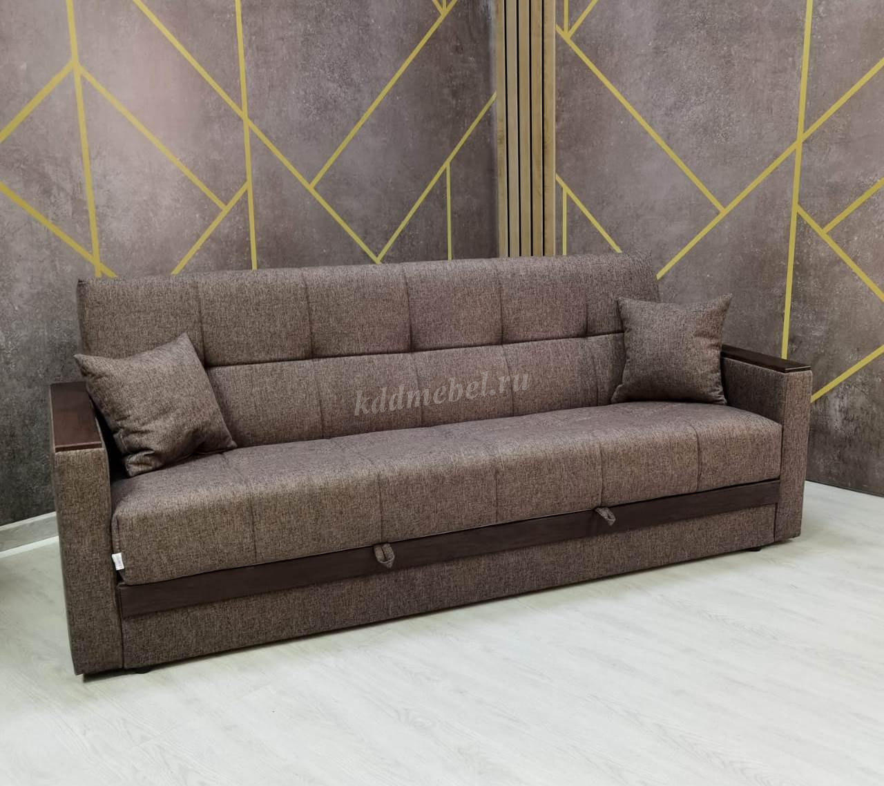 При трансформации требуется расстояние между диваном и стеной. Мебель является пристенной. Механизм «Книжка» прост и надежен в эксплуатации. Напольное покрытие в процессе раскладки не задействовано, Вы можете использовать пушистые ковры или дорогие паркеты. Емкость для хранения постельных принадлежностей с ламинированным основанием обеспечит Вам дополнительное пространство для хранения и сэкономит Ваше время при подготовке дивана ко сну. Ламинированное основание обеспечит простоту и удобство при уборке. Декоративные накладки из МДФ на подлокотниках и передней части короба, сочетают в себе представительность и элегантность, придают изящность дизайну