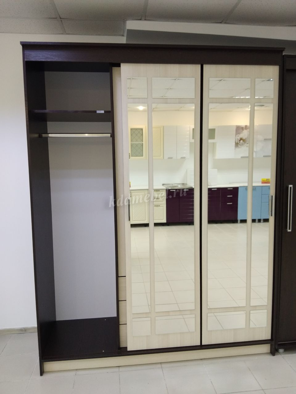 Удобный и вместительный шкаф-купе ЛОРД благодаря необычному дизайну хорошо подойдет интерьеру в любом стиле. Изюминкой шкафа являются оригинальные зеркальные фасады. Шкаф отлично будет смотреться в спальне или прихожей, добавляя помещению света. Два боковых отделения шкафа предназначены для хранения одежды и комплектуются антресольной полкой и 3 штангами. Центральное отделение в нижней части оборудовано тремя вместительными ящиками, верхняя часть с распашными дверцами комплектуется полками.