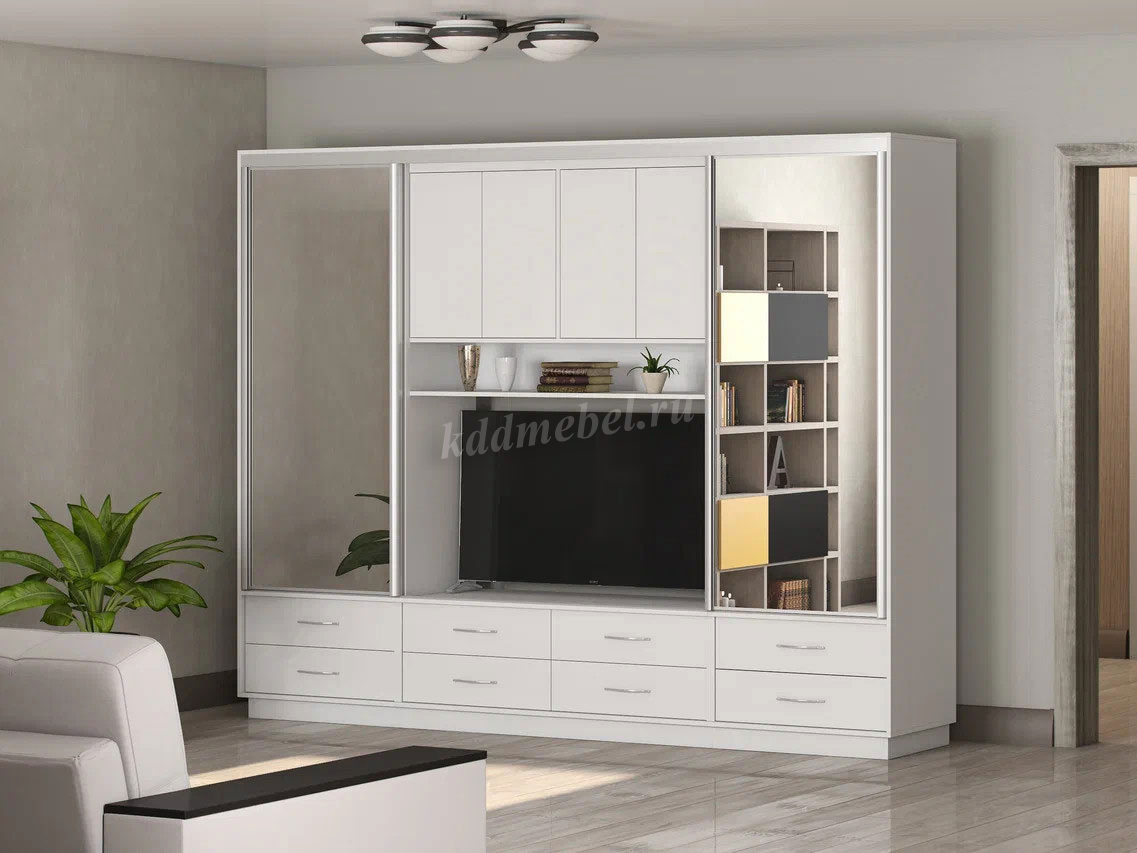 Отдельные секции с вешалками, полками, выдвижными ящиками и отдельной нишей под ТВ - это, пожалуй, лучшая идея для небольшой квартиры.