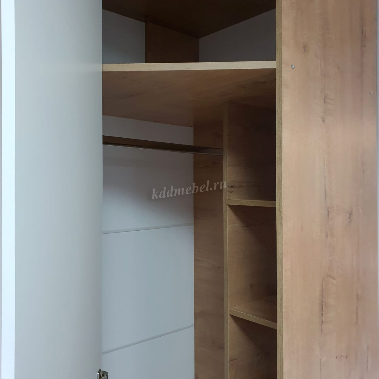 Внутри снабжен полками для хранения белья и вещей и штангой под вешалку для верхней одежды.