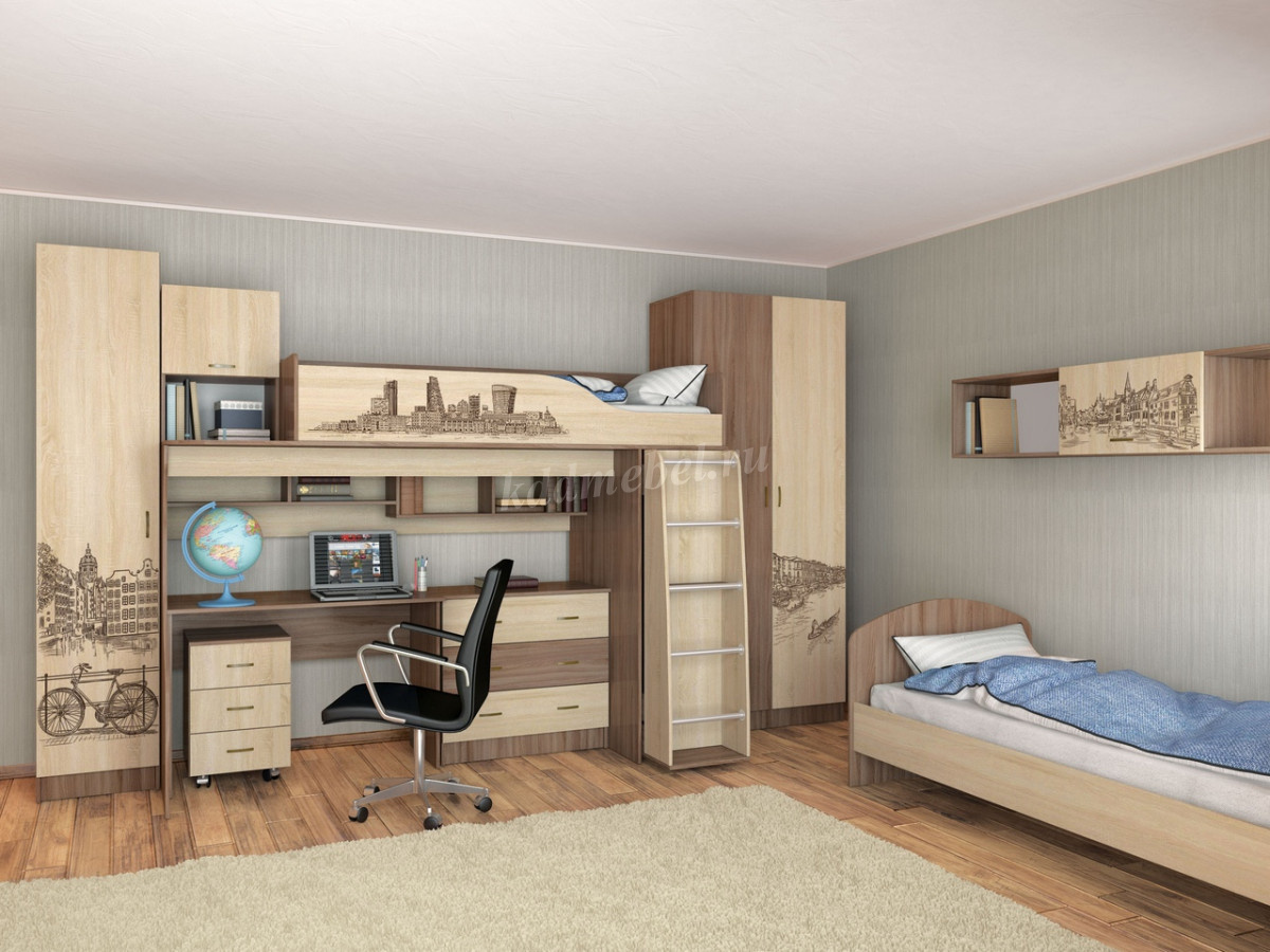 Композиция для детской спальни Орион - идеальное решение как для просторной комнаты, так и для малогабаритной квартиры. Широкий выбор модулей: функциональная кровать-чердак с встроенным шкафом, пенал с выдвижными ящиками, полноценный комбинированный шкаф со стандартной штангой и полками. Классические цвета исполнения прекрасно сочетаются с дизайнерскими изображениями городов мира, наненсенными на фасады методом цветной фотопечати.